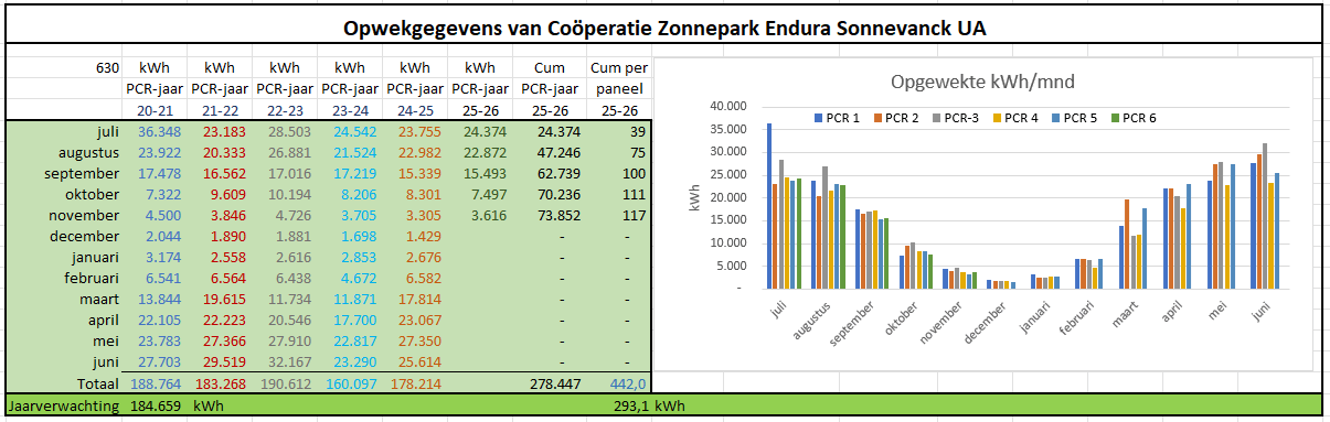 Het eerste PCR-jaar is gestart op 1 juli 2020 en duurt tot en met 30 juni 2021. Begin juli 2021 zullen de deelnemers weten hoeveel groene stroom zij hebben opgewekt. De hoeveelheid opgewekte kWh wordt door Endura doorgegeven aan de energieleverancier van de desbetreffende deelnemer, zodat de Energiebelasting met de deelnemer kan worden verrekend. Hieronder staat de actuele energie-opwek van dit zonnepark vermeld.